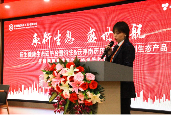 儀式上,衍生健康醫(yī)藥(廣東)有限公司市場部總監(jiān)覃珊女士做為項目對接人介紹了本次雙方合作簽約背景,她表示:“本次雙方的合作介于兩個最火的市場關(guān)鍵詞:一是健康;二是互聯(lián)網(wǎng)+時代。在過去的2020年一場疫情推動了全世界人民對“健康”的意識!而 “全民健康-堅持預(yù)防為主、倡導健康文明生活方式”更是列入了十九大會議“健康中國戰(zhàn)略”的一個重要方針!衍生集團一直專注「婦兒,中醫(yī),中藥,醫(yī)療」版塊,致力于中醫(yī)文化傳承、中醫(yī)藥及“藥食同源”健康產(chǎn)品的科研、生產(chǎn)、市場銷售業(yè)務(wù),并以中醫(yī)文化“藥食同源“防范于未然 的健康調(diào)理系列產(chǎn)品收獲了社會各界及消費者的認可。同時,衍生集團于2018年投建、2020年投入使用、建筑面積達72680平方米的衍生健康醫(yī)藥產(chǎn)業(yè)園,正式落戶云浮,筑建中醫(yī)文化特色及“藥食同源”大健康產(chǎn)業(yè)產(chǎn)品供應(yīng)與服務(wù)鏈!